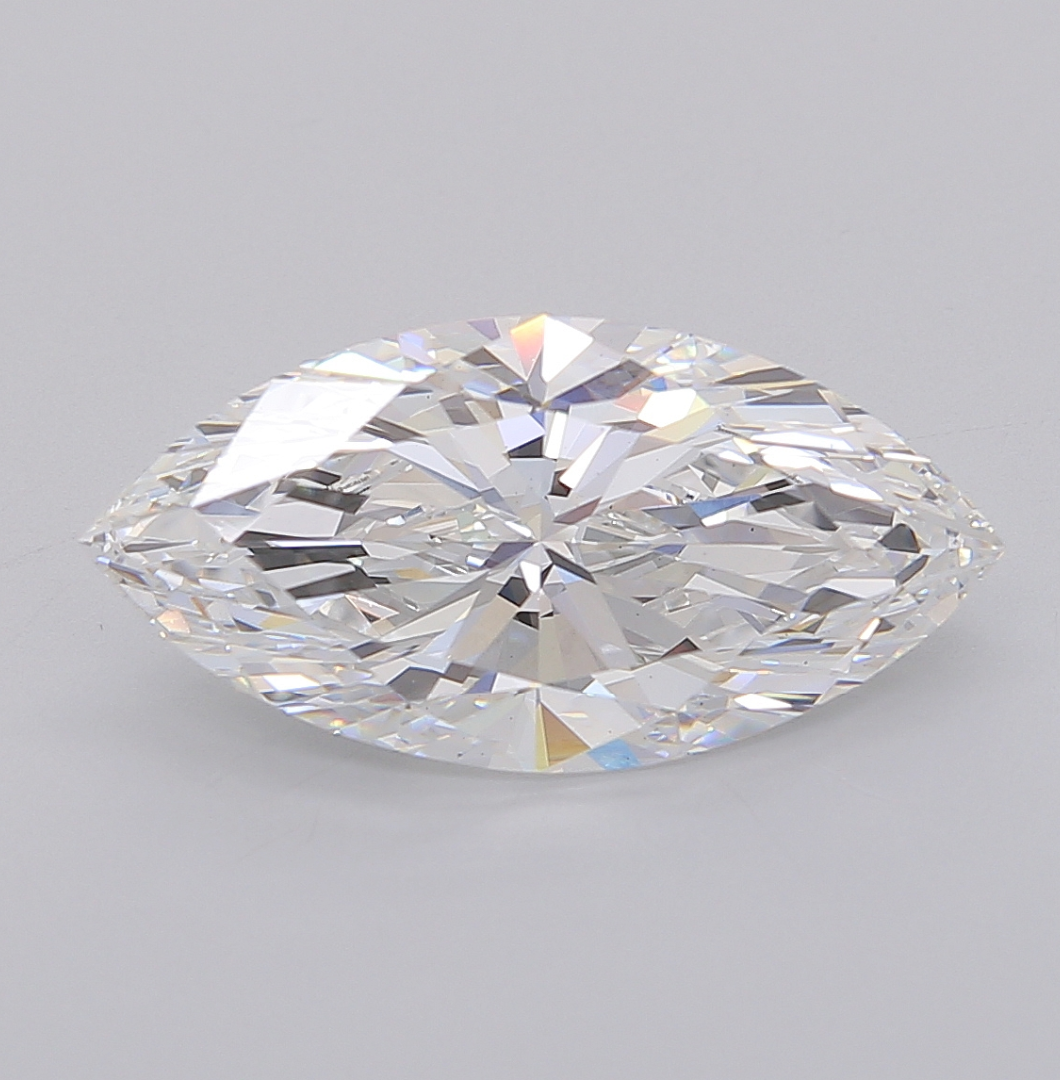This exceptional 4.11 carat marquise-shaped lab grown diamond from GPX Diamonds represents the pinnacle of elegance, precision, and ethical luxury. Crafted using advanced laboratory techniques that replicate natural diamond formation, this stone is identical to mined diamonds in every way optically, chemically, and physically while offering a sustainable and environmentally conscious alternative. Certified by the International Gemological Institute (IGI), the diamond is graded E in color, placing it among the highest color grades for a diamond, with an icy white brilliance that appears completely colorless to the naked eye. With a VVS2 clarity grade, the diamond contains only minute inclusions that are invisible without magnification, ensuring a clear and vibrant appearance.